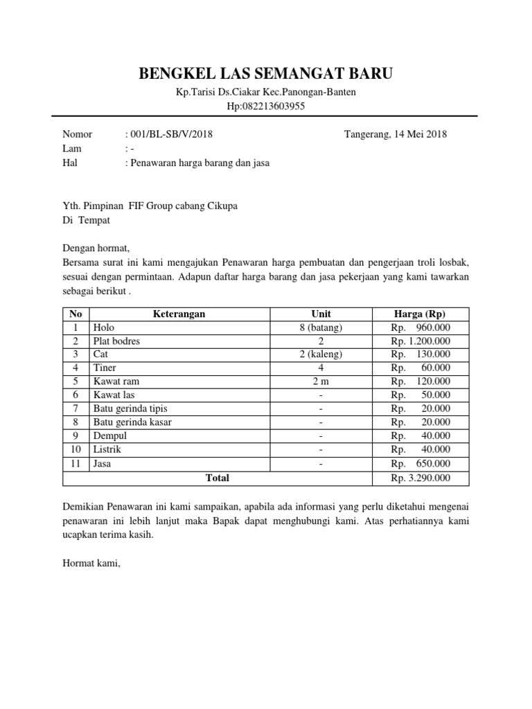 15 Contoh Surat Penawaran Harga Barang Jasa Dan Pekerjaan Suratresmi Id from www.suratresmi.id Surat ini juga memberikan informasi secara jelas mengenai berapa biaya yang harus dikeluarkan. 7 contoh surat penawaran harga barang kerjasama dan jasa. Apakah anda sedang mencari informasi mengenai surat penawaran? Tak memandang usia, banyak dari mereka yang masih berusia remaja bahkan yang sudah tua juga menggeluti profesi. Tidak berbeda dengan penjualan produk, penjualan jasa tetap memerlukan trik marketing yang tepat sasaran. Dalam dunia bisnis, penawaran akan selalu ada antara pihak satu dengan pihak lainnya. Tujuan dibuat surat penawaran ini, supaya jasa atau barang yang anda tawarkan bisa berjalan dengan lancar. Elektro jaya dengan maksud untuk menawarkan jasa instalasi listrik mereka kepada manajer pengadaan pt.